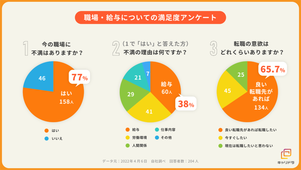 4月にアンケート調査を実施した結果、回答者のうち約4割が現職の「給与」に不満を持っていることがわかりました。
